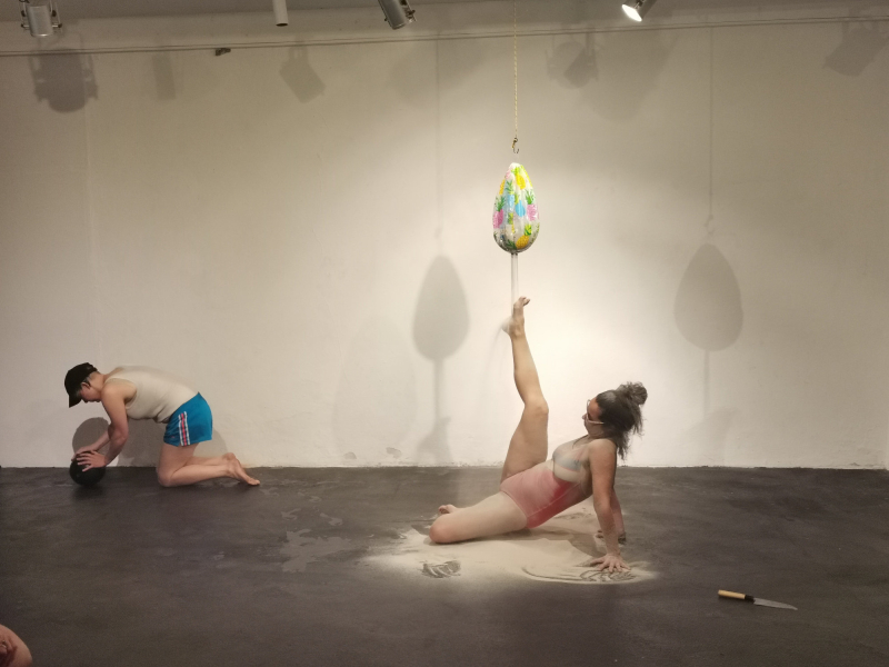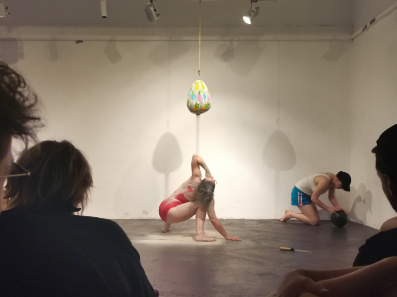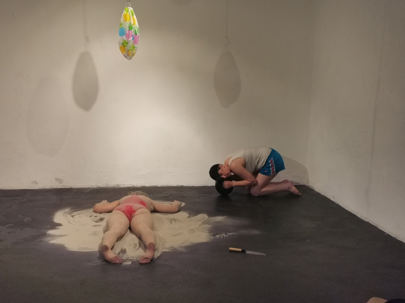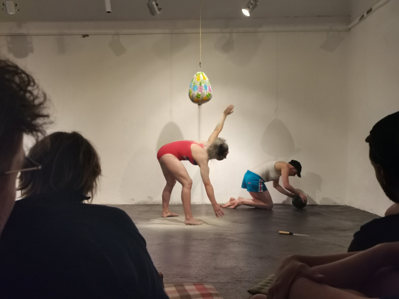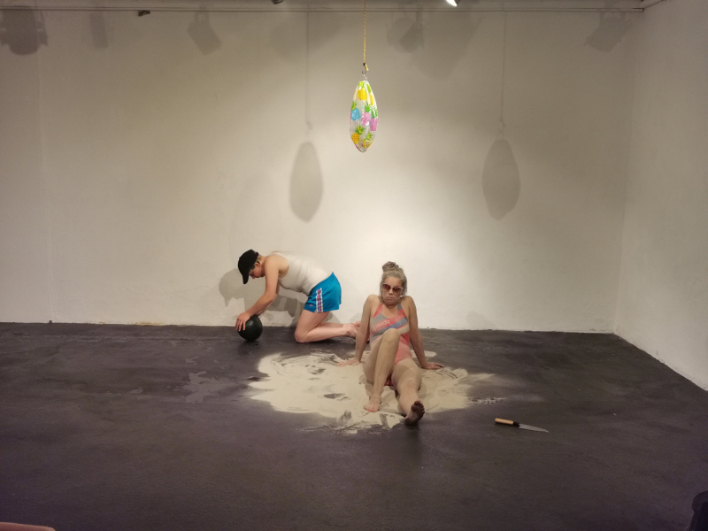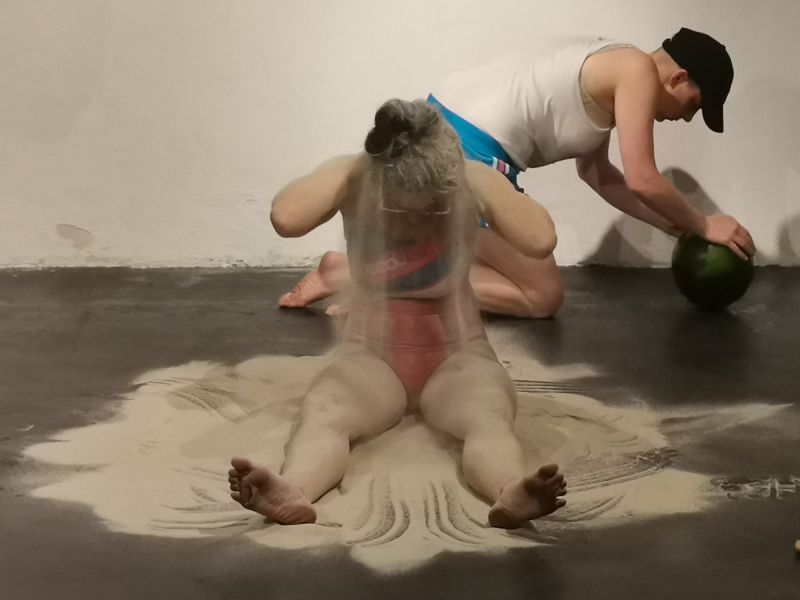 Ein mit Sand gefüllter Wasserball, der von der Decke hängt. Ein großes Messer. Eine Wassermelone. Zwei Performerinnen. Die eine (Maria Berauer) in Badeanzug, mit Sonnenbrille, suhlt sich im Sandstrahl und verpasst ihrem zuvor mit Honig überzogenen Körper lustvoll eine All-Over Sandpanade. Die andere (Birgit Wagner), in Shorts und Unterhemd, mit schwarzer Kappe, auf allen Vieren, rollt unentwegt eine Wassermelone vorn links nach recht, von rechts nach links. Dazu knisterndes Sandrieseln aus dem Lautsprecher.
