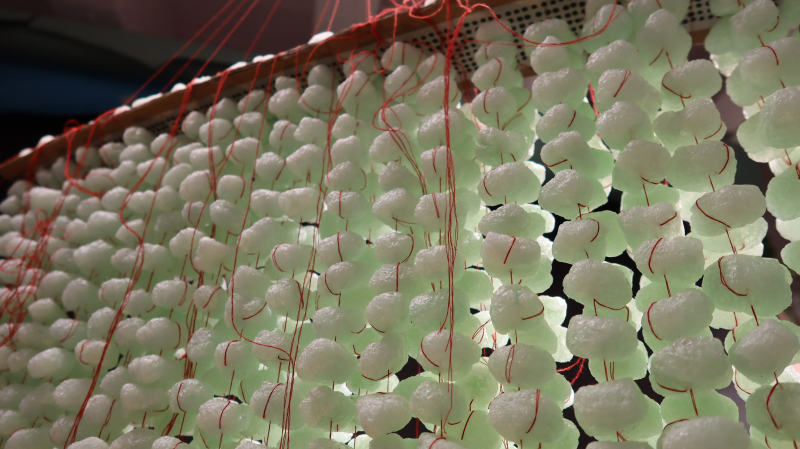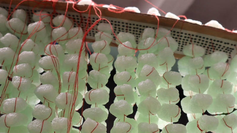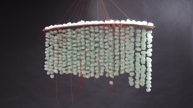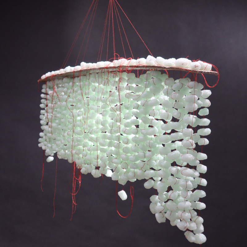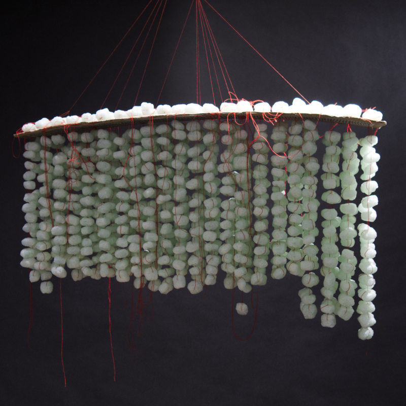 Luftobjekte sind Hängekörper. Feine Fadenreihen sind beschwert durch luftige, blasse Knödel. Sie pendeln wie ein wallender Schwarm. Ein rechteckigen Grundriss wird durch den Trägerkarton vorgegeben.