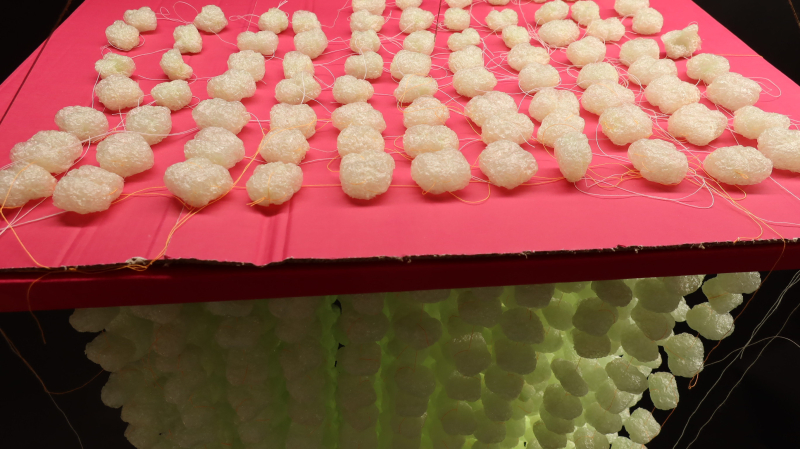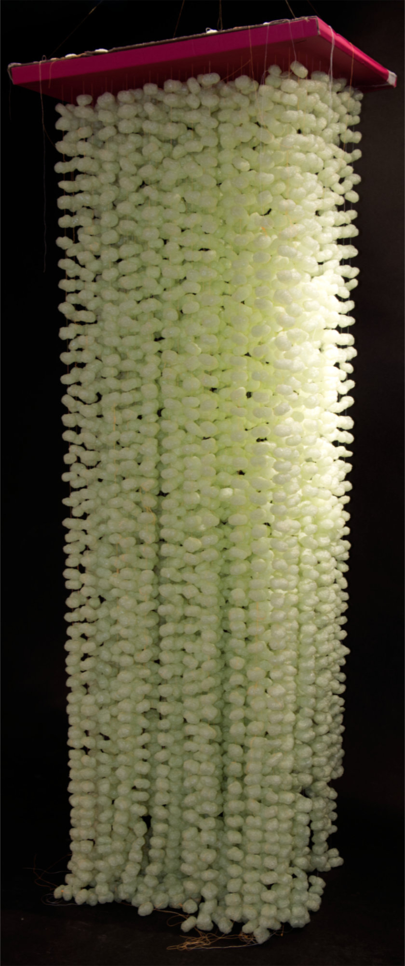 Luftobjekte sind hängende, fließende Körper aus aufgefädelten Maischips. Feine Fadenreihen sind beschwert durch luftige, blasse Knödel und ergeben einen vagen, quadratischen Grundriss, der durch einen farbigen, flach gefalteten Trägerkarton vorgegeben wird. Parallel pendeln die Fäden wie ein wallender Schwarm.