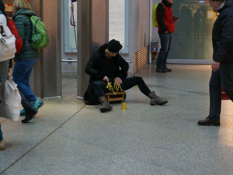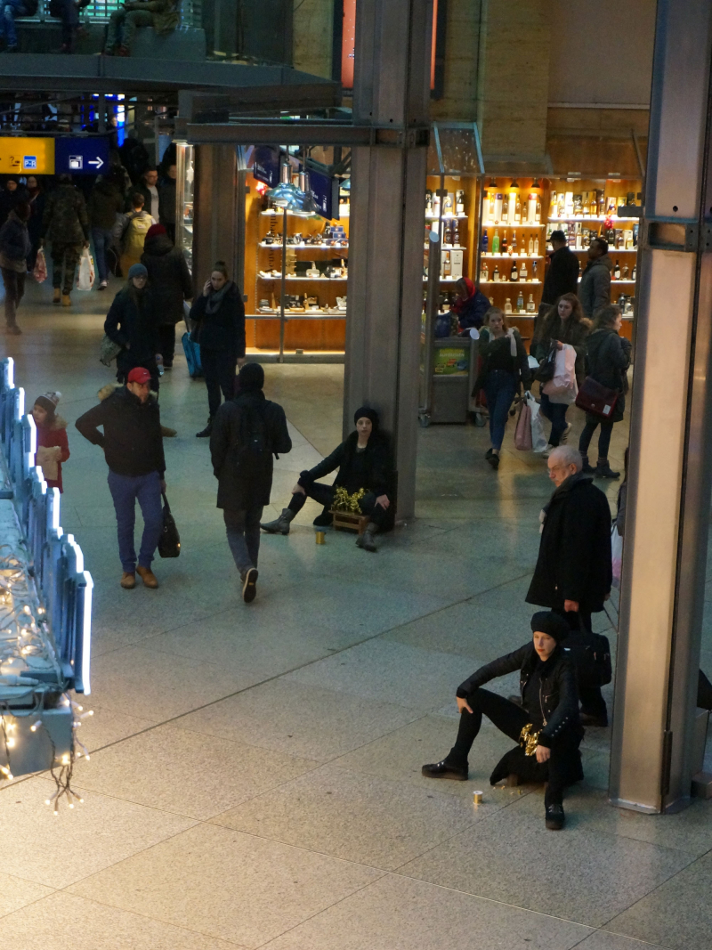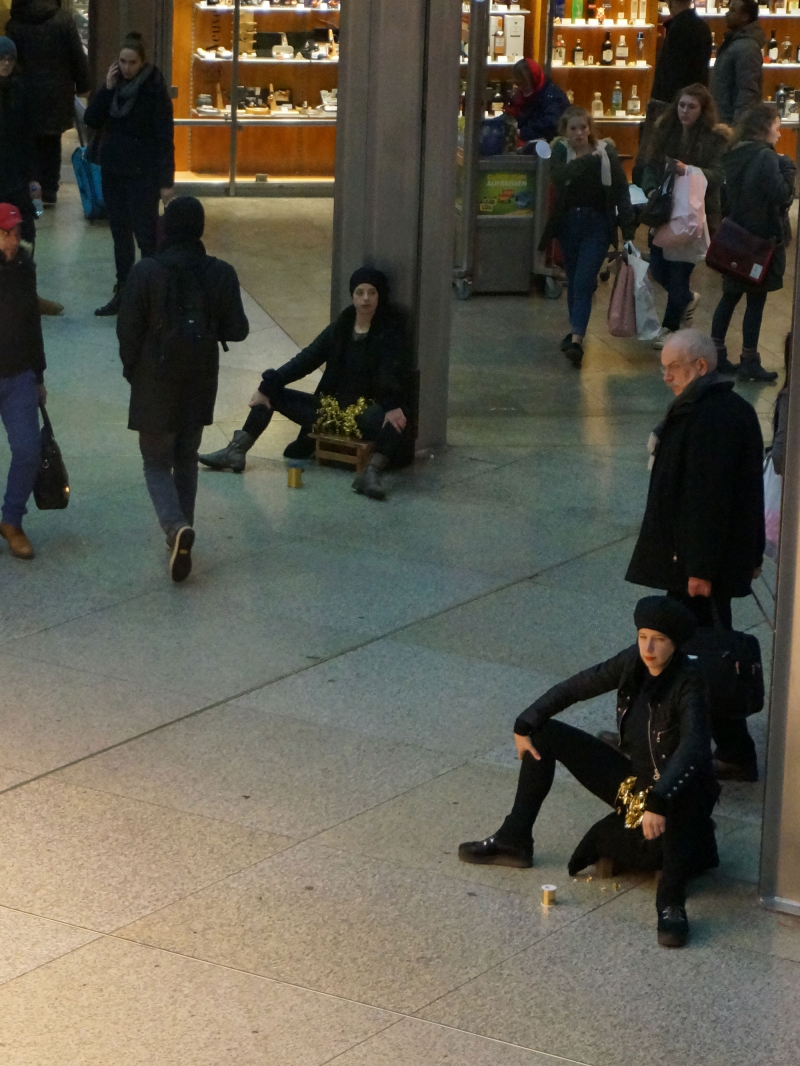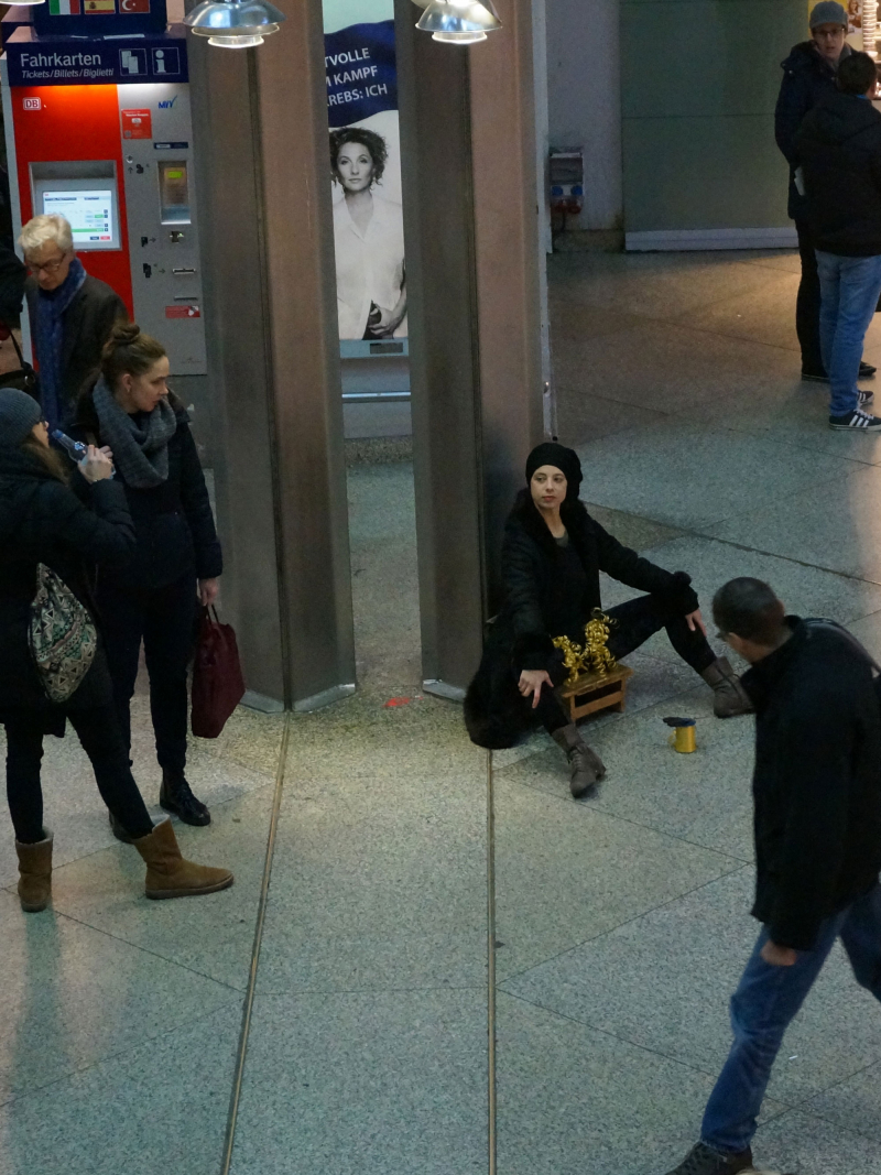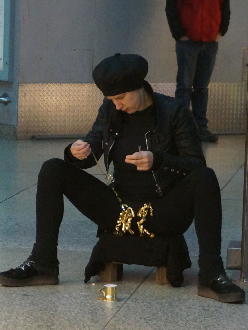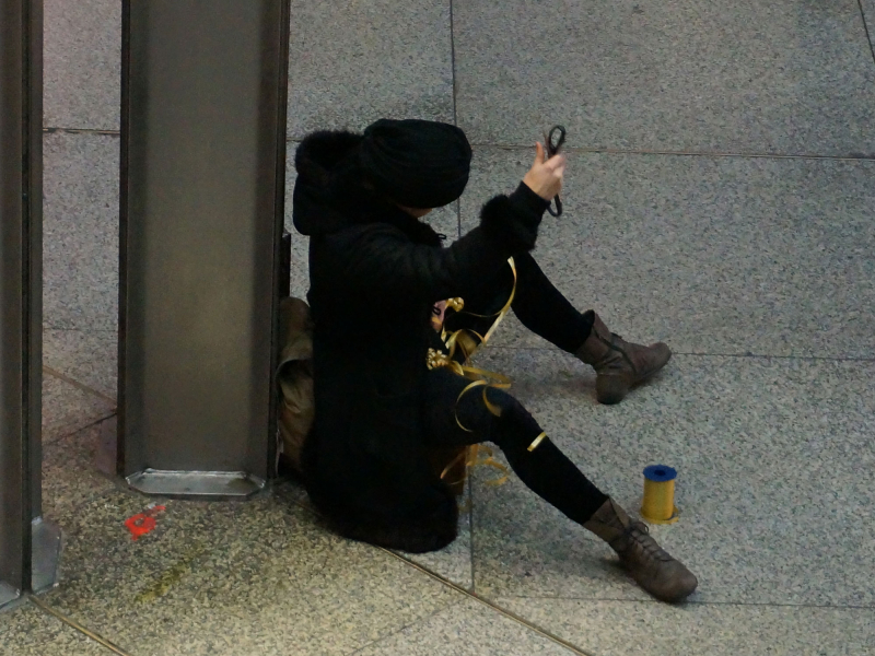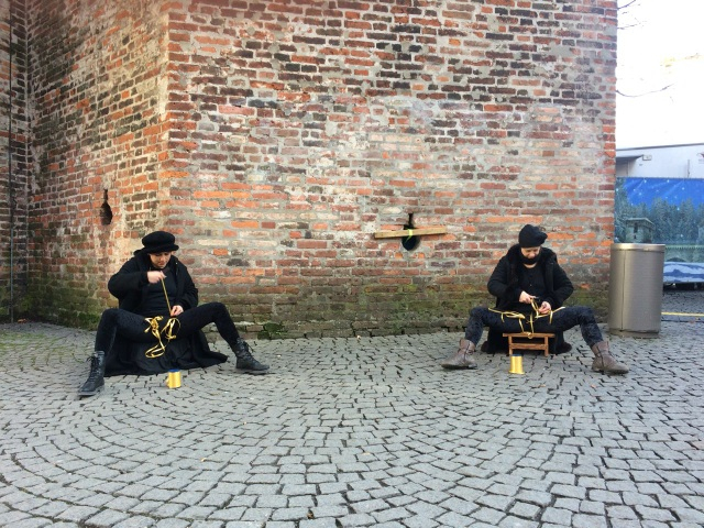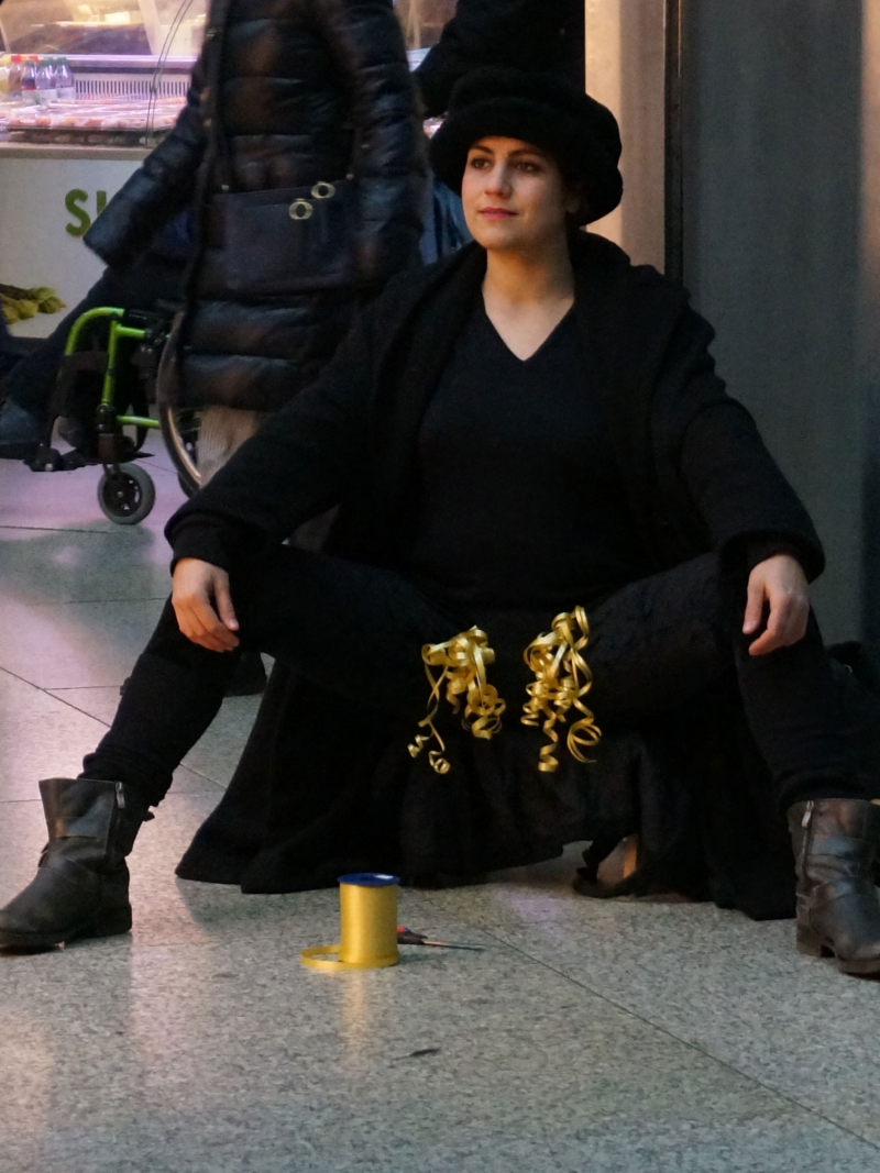 Eine schwarze Pantie über einer schwarzen Leggings getragen dient zum befestigen von Geschenkband. Während die Performer*innen auf einem Schemel sitzen fädeln sie die goldene Abschnitte ein und zwirbeln sie zu kleinen Locken.