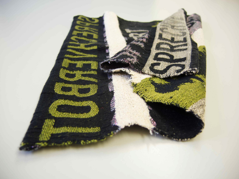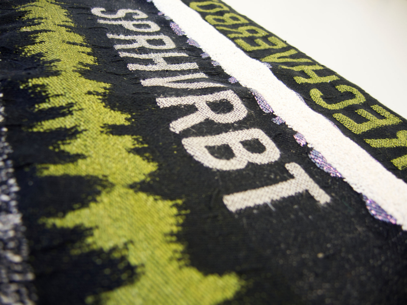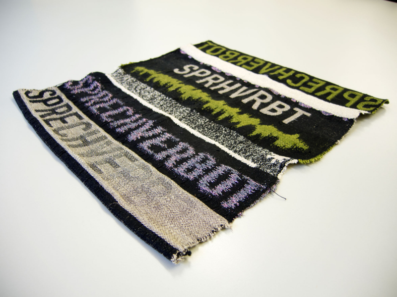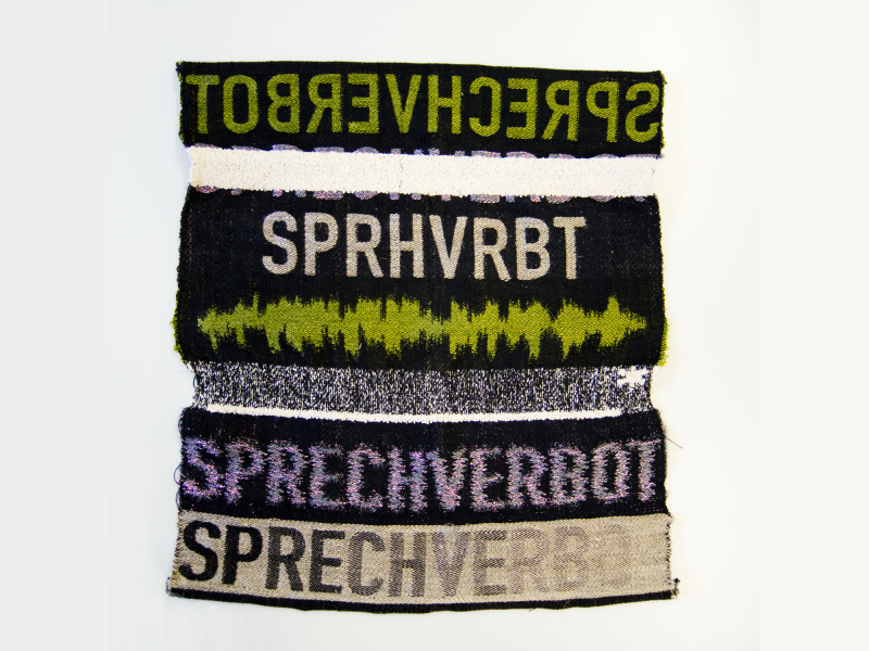 Nicht alles Sag-bare darf ausgesprochen werden. Verbote sind starke Reglementierungen, aber bereits gesellschaftlicher Druck kann zum Verstummen führen. Sprache verändert sich, Worte werden abgekürzt, sie veralten, verschwinden und bieten die Basis für neue Formulierungen. Etwas soll nicht gesagt werden, das können Betrachter*innen immer wieder nachlesen. SPRHVRBT wurde auf einem halbelektronischen Jacquardwebstuhl gefertigt. Ein digitaler Entwurf übermittelt die Information welcher der 880 Kettfäden gehoben oder gesenkt wird. Der Schuss wird von Hand eingezogen und angeschlagen.